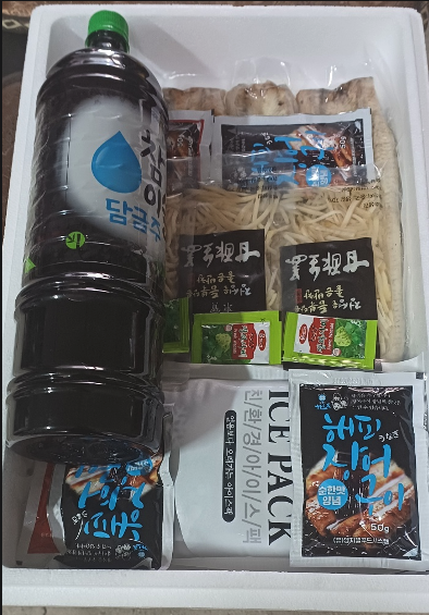 택배 배송 구성 : 장어 2KG + 초생강 + 소스 + 아이스팩 (좌) / 복분자 1.8L (우)